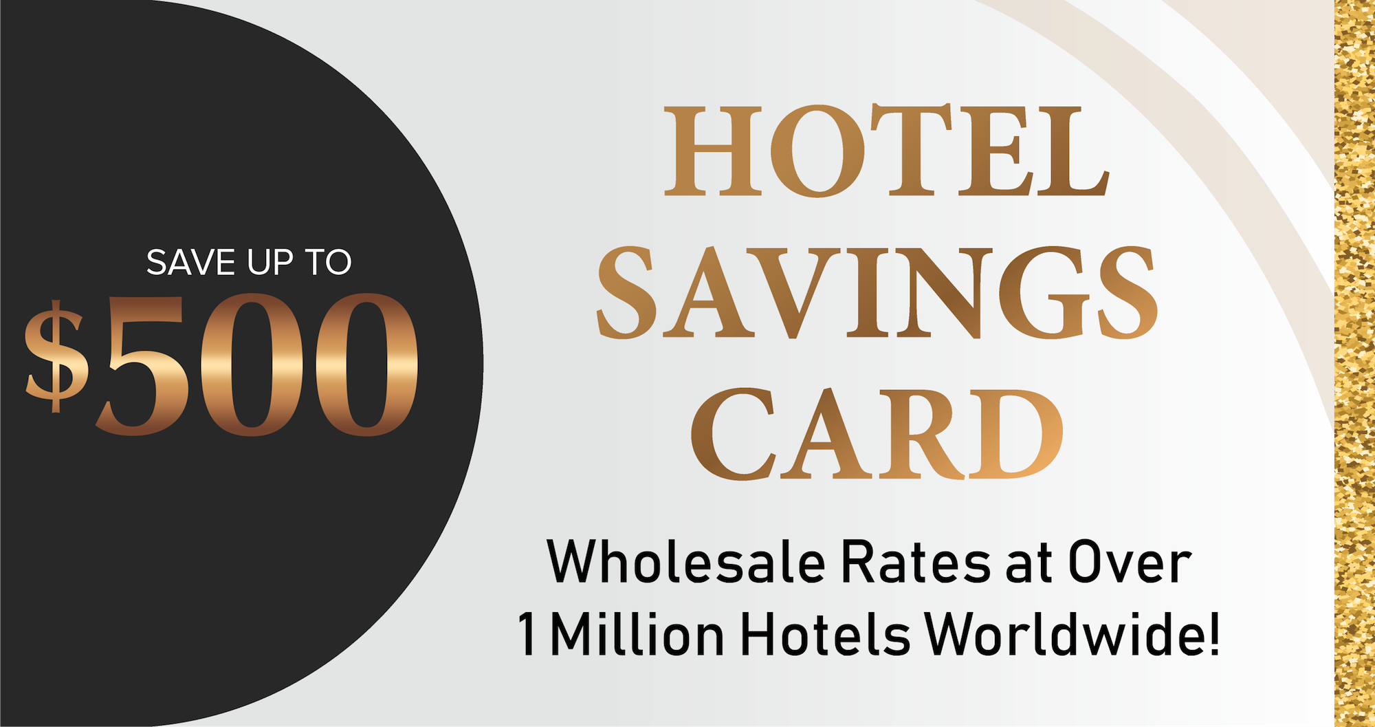 The Hotel Savings Card will provide you with cash credits to be applied to your next getaway! Schedule A Free Consultation to this great cause and you shall receive the benefit of Travel Agency Wholesale rates for your next family getaway.